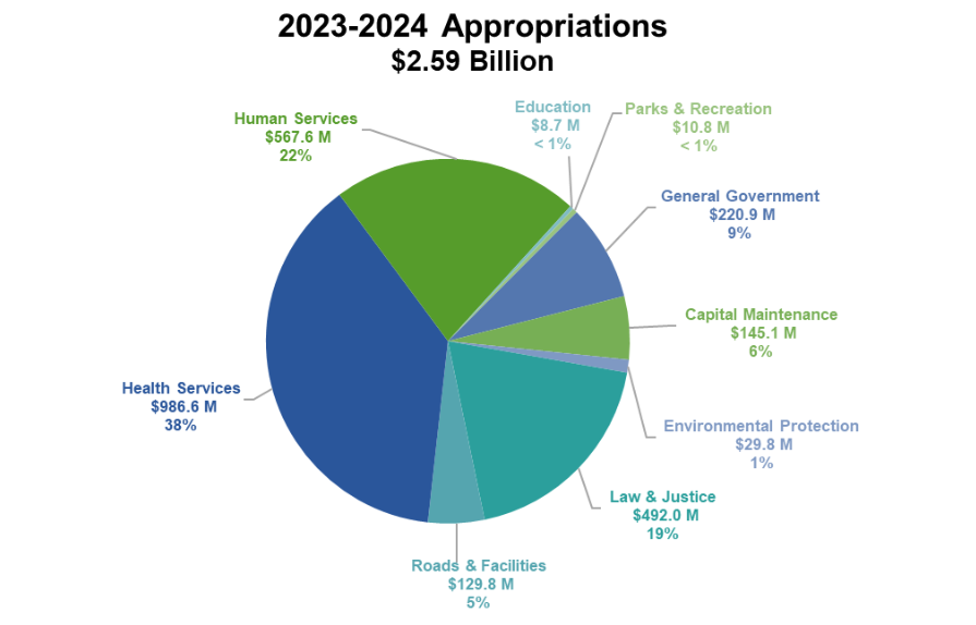 The 2023-2024 Approved Budget is a structurally balanced budget totaling $2,591,302,580. This represents an increase of $370.8 million from the 2022-2023 Adjusted Budget. Appropriations by functional area include:
