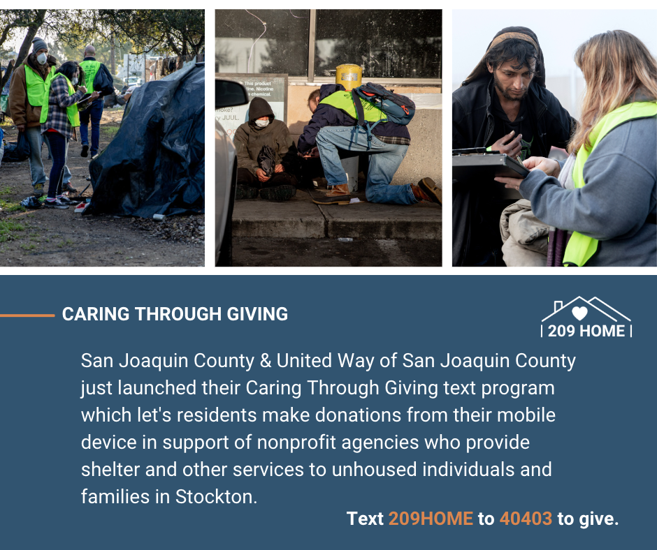 Stockton, CA – Today, San Joaquin County (County) and United Way of San Joaquin County (United Way) launched a six-month, text-to-give fund raising pilot in the City of Stockton called Caring Through Giving. This program enables individuals to make donations from their mobile device in support of nonprofit agencies who provide shelter and other services to unhoused individuals and families in the City of Stockton.